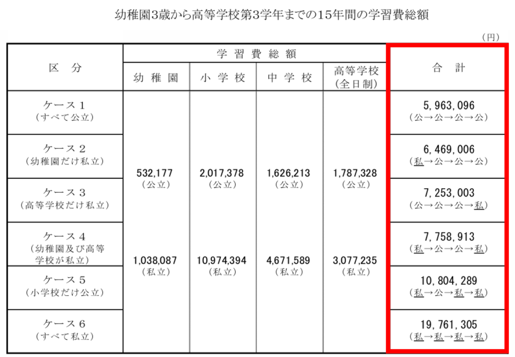 すべて公立の<ケース1>でも15年間で約600万円、高校が私立の場合は3年間で約300万円の学習費となっています。