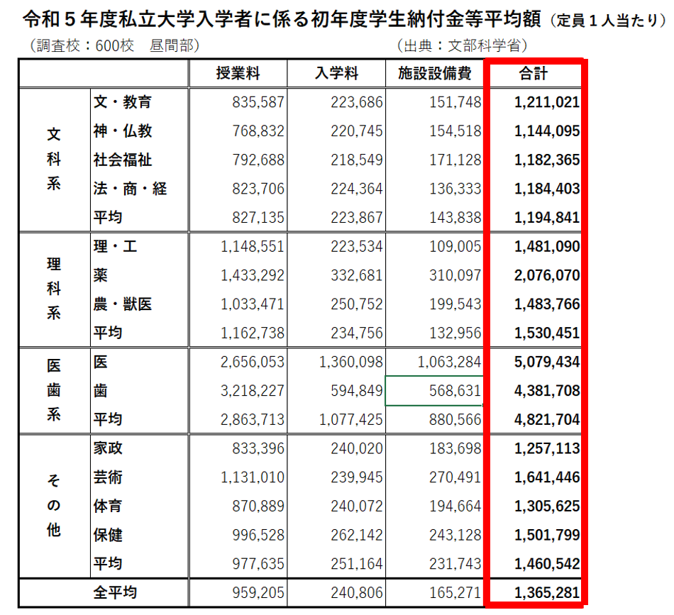⇩私立大学の入学初年度の学費など。2年目以後は入学料を除いた費用がかかります。